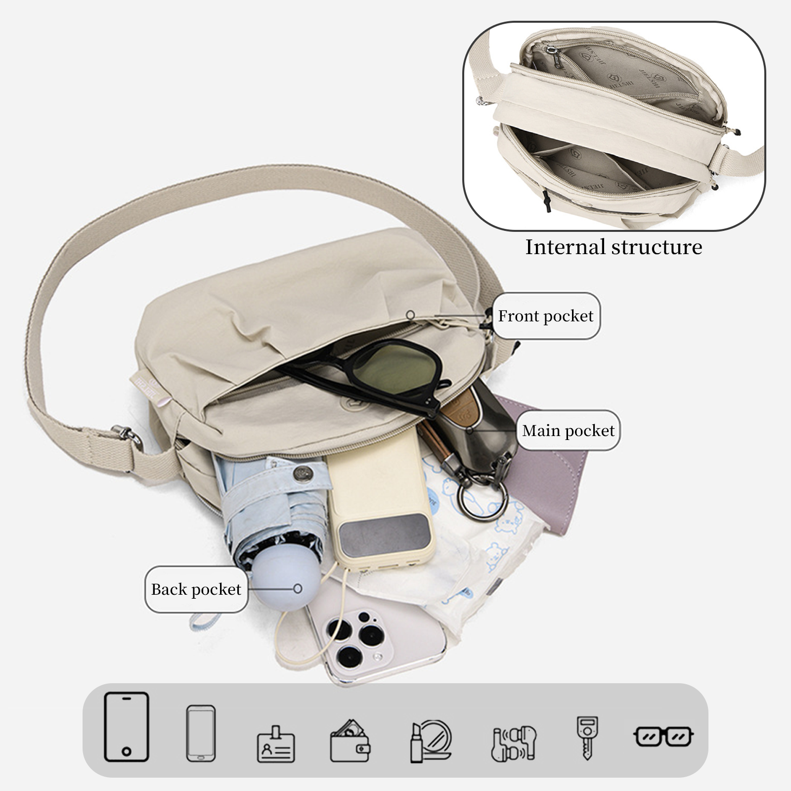 【Large Capacity Travel Crossbody Bag】Considerably consider your daily and travel storage items, there are 6 pockets:1 main pocket, 1 auxiliary pocket, 1 front pocket, 1 zipper pocket, 1 card pocket, 1 back pocket. Practical structure to keep your belongings organized and easy to use.